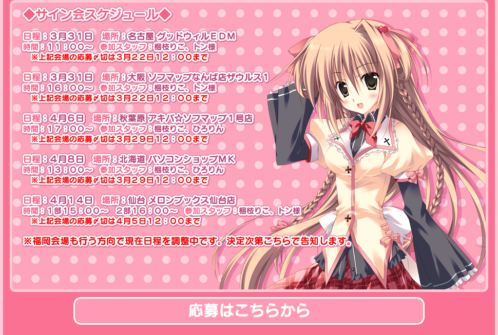 会場は名古屋、大阪、秋葉、北海道、仙台、福岡の6箇所で開催予定で参加には、いずれも公式サイトで事前抽選となっております。