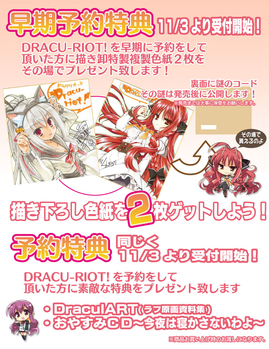 インターネットラジオ音泉内のおといずみ部屋にて対象商品を一回の会計で3000円以上お買い上げの方に抽選で21名の方に番組パーソナリティである民安ともえさん、緑川光さん、鈴田美夜子さんの寄せ書きサインが入った色紙がもらえます。